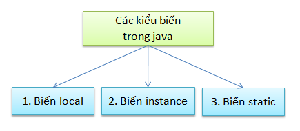 Trong java, biến là tên của vùng nhớ. Có 3 kiểu biến trong java, bao gồm biến local (biến địa phương), biến instance (biến toàn cục) và biến static.
