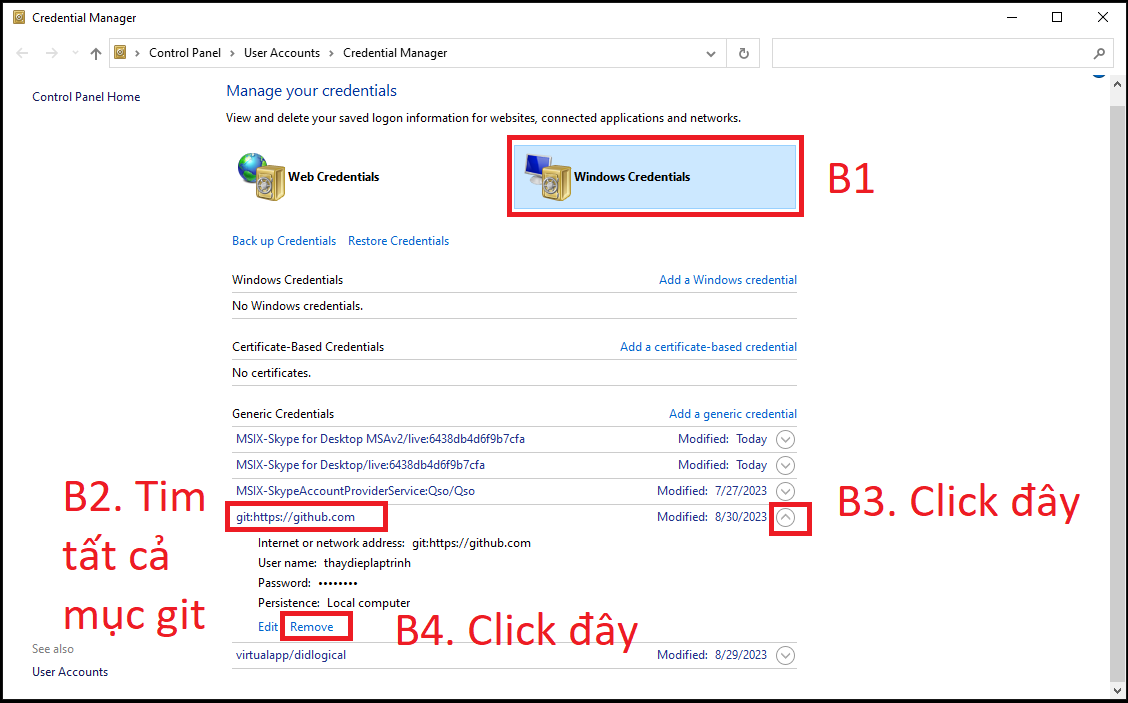Hướng dẫn xóa tài khoản git/github đã lưu trên Window