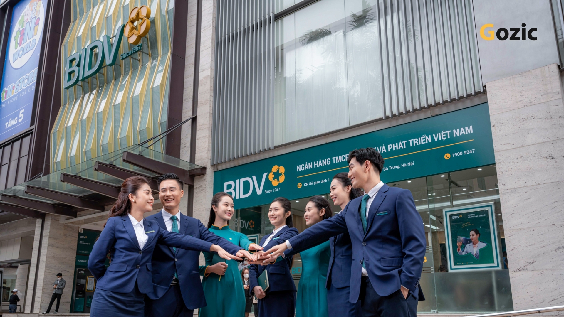 Không gian làm việc: Bảng hiệu chi nhánh, phòng giao dịch, đồng phục nhân viên.