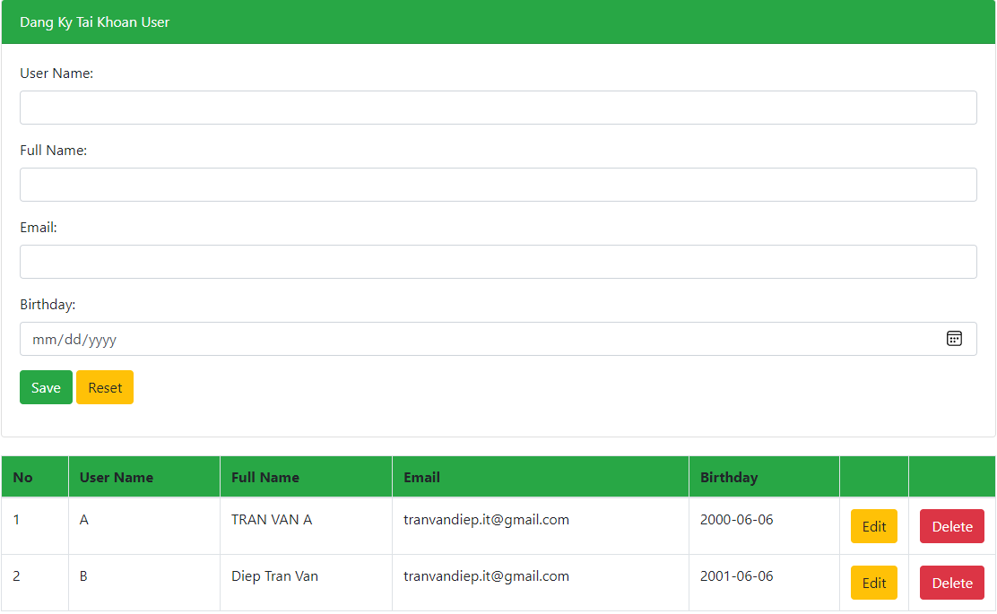 Hoàn thành các chức năng : Thêm, sửa, xoá như hình trên.