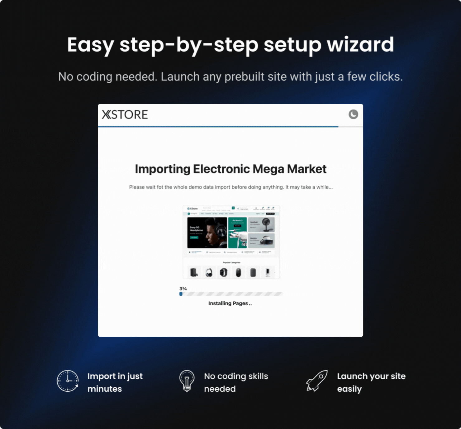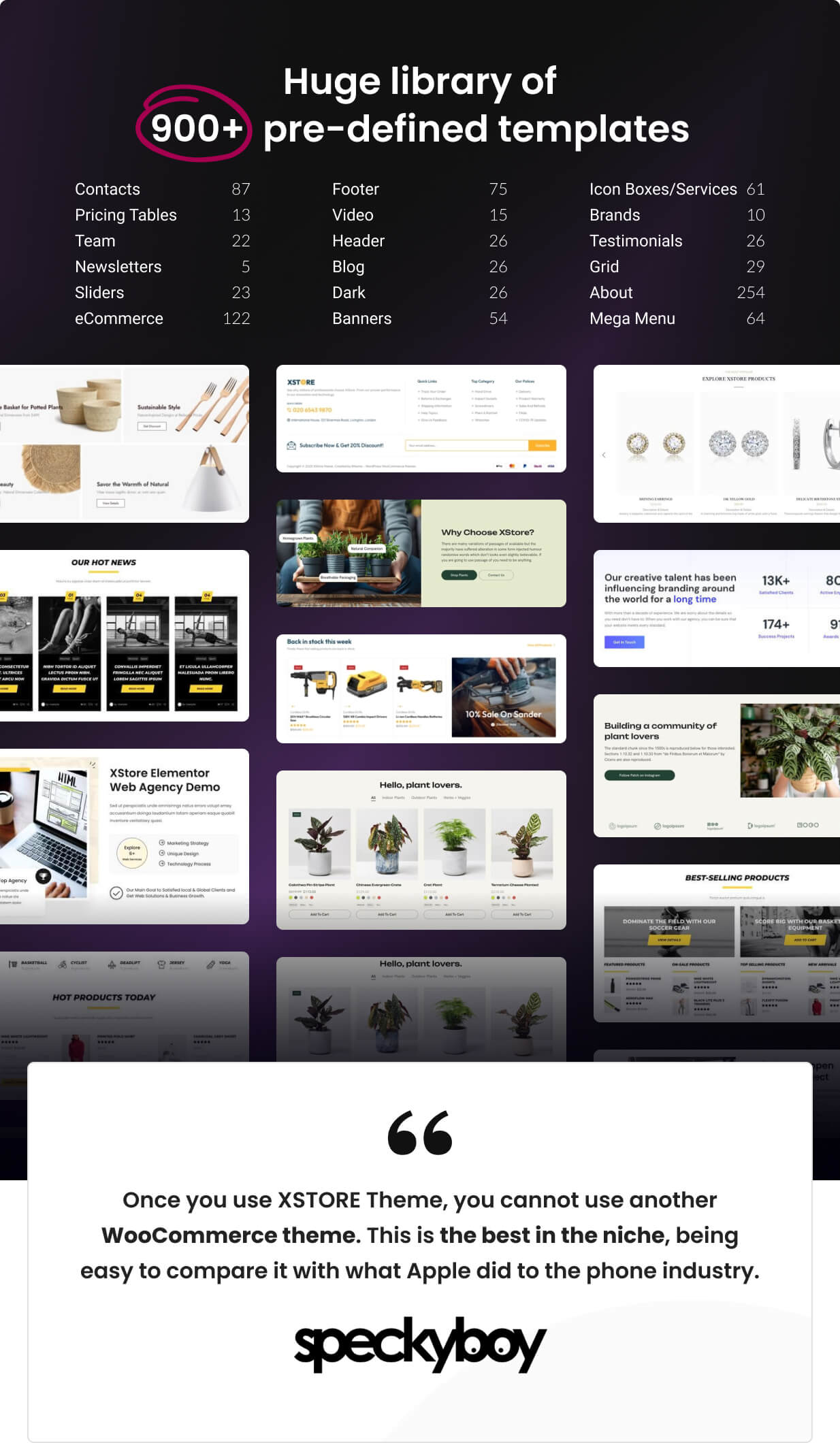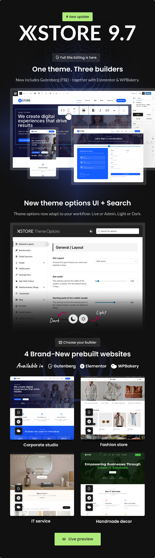 Điểm nổi bật của XStore nằm ở kho giao diện mẫu phong phú, cho phép bạn nhanh chóng triển khai website theo nhiều phong cách khác nhau mà không cần bắt đầu từ con số 0. Mỗi bố cục đều được tối ưu kỹ lưỡng để đảm bảo tính thẩm mỹ, khả năng hiển thị và hiệu quả chuyển đổi, giúp bạn tiếp cận khách hàng một cách chuyên nghiệp hơn.