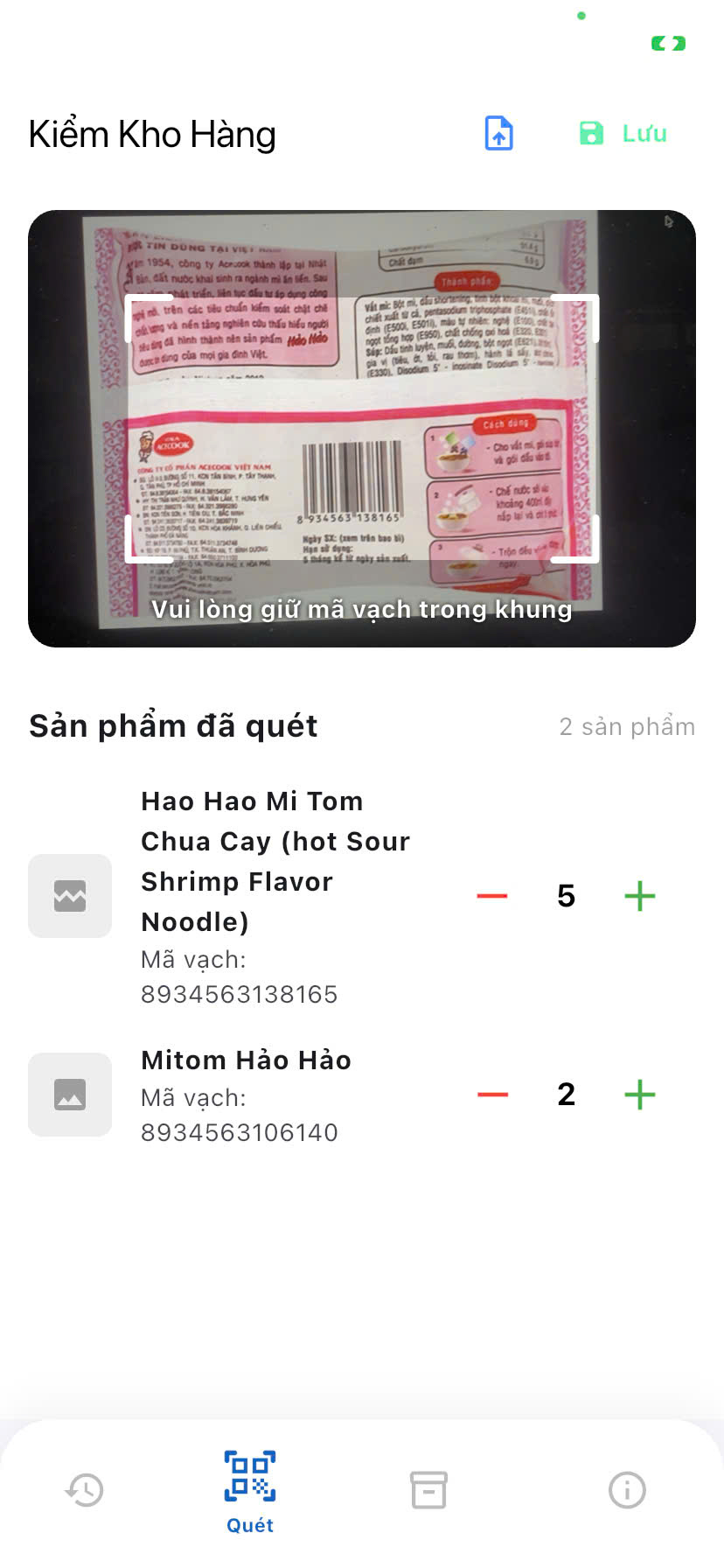 Tính năng quét mã vạch tích hợp biến thiết bị thành app quản lý kho bằng mã vạch mạnh mẽ. Người dùng chỉ cần quét bằng camera thay vì nhập thủ công.